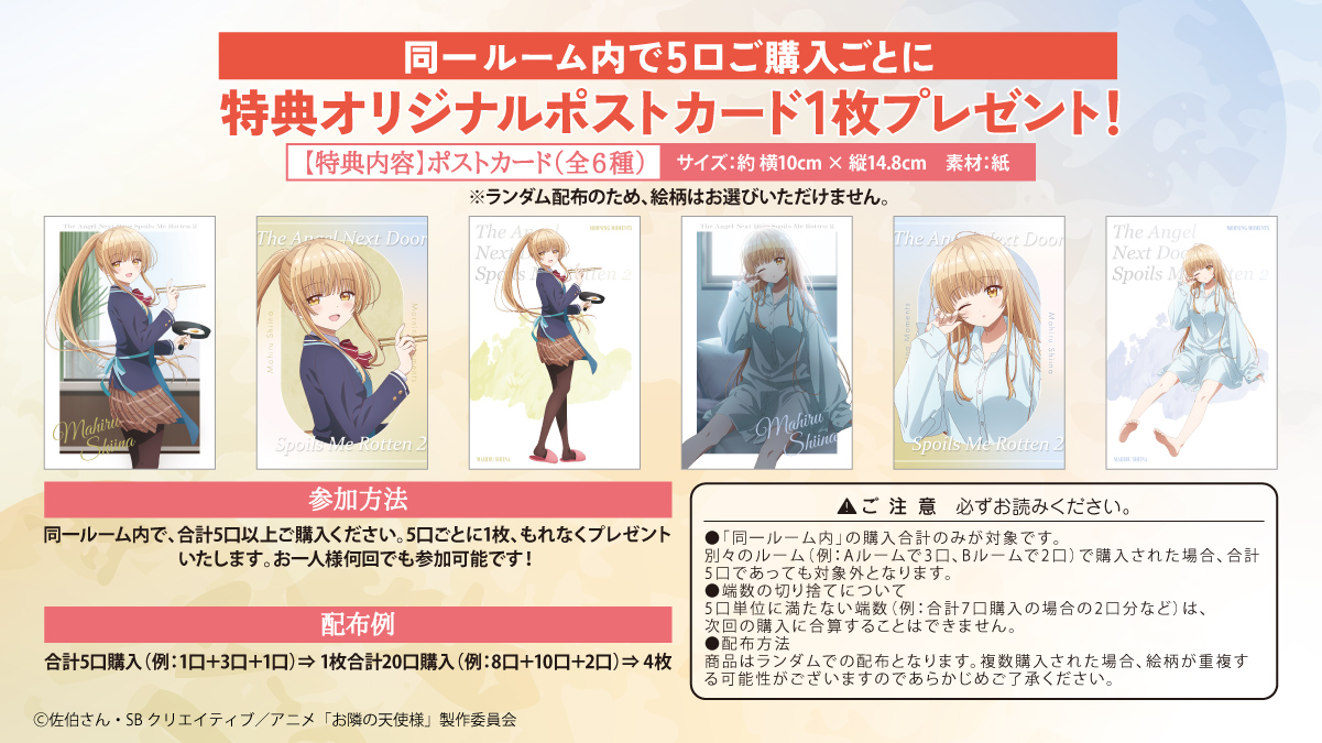 くじQ お隣の天使様にいつの間にか駄目人間にされていた件 朝のひととき ルーム6 残りくじ数 0/70 残りBOX数 0/1 くじ1枚 880円(税込) 現在このくじは販売していません Quantity カートに追加しました。 お買い物を続ける カートへ進む カートに未決済のくじが残っています 現在カートに入っているくじの決済を完了させる、 または削除の上、改めてくじをご購入ください。 この内容についてよくある質問で確認する 販売期間 2026年03月02日 (月) 17:00 〜 2026年03月30日 (月) 23:59 まで 配送手数料 同一ルーム内で複数回注文でも【20個まで】全国一律800円(税込) で配送 お届け目安 2026年5月下旬 決済方法 下記のお支払い方法がご利用いただけます。 クレジットカード (VISA/MasterCard/JCB/AMEX/Diners) d払い auかんたん決済 ソフトバンクまとめて支払い PayPay決済 残りくじ数 0/70 残りBOX数 0/1 くじ1枚 880円(税込) くじを購入する 10連くじを購入する 注意事項 表示されている賞品は、現在販売中のBOXの残り賞品です。現在のBOXが完売した場合、次のBOXの販売となります。 くじ70回ごとに賞品はリセットされるため、常にリロードし最新のバージョンにしてください。 回線制限を含むタイミングによっては、タッチの差で他ユーザーが先に購入され、表示内容とは異なる賞品が当選する場合がございます。 短期間に同一賞品を複数回購入する場合、不正利用を含むセキュリティーにより一時的にアクセス制限かかる場合がございます。 発送手数料は「ルーム毎」に発生します。同一商品でも「ルームを跨いで購入した場合」は、それぞれ発送手数料が発生します。 くじの上限に達した場合、購入できない場合がございます。 くじの上限に達した場合、追加される場合がございます。 注文状況によってお届け目安が前後する場合があります。 本賞品の販売は予告なく内容の変更や、販売期間の終了・延長・再販売をする場合があります。 画像はイメージです。実際の賞品と異なる場合があります。 くじ賞品 LINE UP 椎名真昼アクリルパネル【朝食】 当選確率 1% 販売終了 椎名真昼アクリルパネル【朝食】 販売終了 椎名真昼アクリルパネル【朝食】 <サイズ>約横14.8×縦21cm <素材>アクリル・鉄 椎名真昼アクリルパネル【寝起き】 当選確率 1% 販売終了 椎名真昼アクリルパネル【寝起き】 販売終了 椎名真昼アクリルパネル【寝起き】 <サイズ>約横14.8×縦21cm <素材>アクリル・鉄 椎名真昼アクリルスタンド【朝食】 当選確率 1% 販売終了 椎名真昼アクリルスタンド【朝食】 販売終了 椎名真昼アクリルスタンド【朝食】 <サイズ>約横9×縦19.5cm <素材>アクリル 椎名真昼アクリルスタンド【寝起き】 当選確率 1% 販売終了 椎名真昼アクリルスタンド【寝起き】 販売終了 椎名真昼アクリルスタンド【寝起き】 <サイズ>約横11.8×縦17.9cm <素材>アクリル 椎名真昼クリアポスター【朝食】 当選確率 3% 販売終了 椎名真昼クリアポスター【朝食】 販売終了 椎名真昼クリアポスター【朝食】 <サイズ>約横29.7×縦42cm <素材>PP(ポリプロピレン) 椎名真昼クリアポスター【寝起き】 当選確率 3% 販売終了 椎名真昼クリアポスター【寝起き】 販売終了 椎名真昼クリアポスター【寝起き】 <サイズ>約横29.7×縦42cm <素材>PP(ポリプロピレン) 椎名真昼クリアポスター【朝食・アップ】 当選確率 3% 販売終了 椎名真昼クリアポスター【朝食・アップ】 販売終了 椎名真昼クリアポスター【朝食・アップ】 <サイズ>約横29.7×縦42cm <素材>PP(ポリプロピレン) 椎名真昼クリアポスター【寝起き・アップ】 当選確率 3% 販売終了 椎名真昼クリアポスター【寝起き・アップ】 販売終了 椎名真昼クリアポスター【寝起き・アップ】 <サイズ>約横29.7×縦42cm <素材>PP(ポリプロピレン) 缶バッジコレクション 全12種(ブラインド仕様)※ブラインドのため、種類指定はできません。 当選確率 37% 販売終了 缶バッジコレクション(ブラインド) 販売終了 缶バッジコレクション(ブラインド) <サイズ>約横5.6×縦5.6cm <素材>鉄・紙・PET クリアカードコレクション 全8種(ブラインド仕様)※ブラインドのため、種類指定はできません。 当選確率 46% 販売終了 クリアカードコレクション(ブラインド) 販売終了 クリアカードコレクション(ブラインド) <サイズ>約横ハート型8.8 / カード型6.3×縦ハート型87 / カード型8.8cm <素材>PP(ポリプロピレン) ボーナスチャンス ラスト賞 2枚の描き下ろしイラストを合わせたB2横タペストリーです! 1BOXの最後(70個目)を引いた方に、もれなくプレゼント!(販売BOX分だけラスト賞が発生します) <サイズ>幅72.8×高さ51.5cm <素材>ポリエステル ©佐伯さん・SBクリエイティブ/アニメ「お隣の天使様」製作委員会 くじQ TOPへ戻る