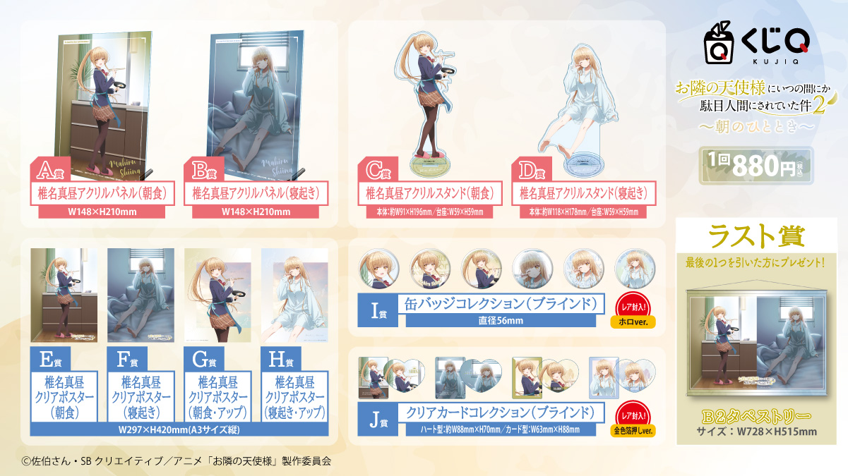 くじQ お隣の天使様にいつの間にか駄目人間にされていた件 朝のひととき ルーム8 残りくじ数 70/70 残りBOX数 9/10 くじ1枚 880円(税込) くじを購入する 10連くじを購入する Quantity カートに追加しました。 お買い物を続ける カートへ進む カートに未決済のくじが残っています 現在カートに入っているくじの決済を完了させる、 または削除の上、改めてくじをご購入ください。 この内容についてよくある質問で確認する 販売期間 2026年03月02日 (月) 17:00 〜 2026年03月30日 (月) 23:59 まで 配送手数料 同一ルーム内で複数回注文でも【20個まで】全国一律800円(税込) で配送 お届け目安 2026年5月下旬 決済方法 下記のお支払い方法がご利用いただけます。 クレジットカード (VISA/MasterCard/JCB/AMEX/Diners) d払い auかんたん決済 ソフトバンクまとめて支払い PayPay決済 残りくじ数 70/70 残りBOX数 9/10 くじ1枚 880円(税込) くじを購入する 10連くじを購入する 注意事項 表示されている賞品は、現在販売中のBOXの残り賞品です。現在のBOXが完売した場合、次のBOXの販売となります。 くじ70回ごとに賞品はリセットされるため、常にリロードし最新のバージョンにしてください。 回線制限を含むタイミングによっては、タッチの差で他ユーザーが先に購入され、表示内容とは異なる賞品が当選する場合がございます。 短期間に同一賞品を複数回購入する場合、不正利用を含むセキュリティーにより一時的にアクセス制限かかる場合がございます。 発送手数料は「ルーム毎」に発生します。同一商品でも「ルームを跨いで購入した場合」は、それぞれ発送手数料が発生します。 くじの上限に達した場合、購入できない場合がございます。 くじの上限に達した場合、追加される場合がございます。 注文状況によってお届け目安が前後する場合があります。 本賞品の販売は予告なく内容の変更や、販売期間の終了・延長・再販売をする場合があります。 画像はイメージです。実際の賞品と異なる場合があります。 くじ賞品 LINE UP 椎名真昼アクリルパネル【朝食】 当選確率 1% 残り 1 個 椎名真昼アクリルパネル【朝食】 椎名真昼アクリルパネル【朝食】 <サイズ>約横14.8×縦21cm <素材>アクリル・鉄 椎名真昼アクリルパネル【寝起き】 当選確率 1% 残り 1 個 椎名真昼アクリルパネル【寝起き】 椎名真昼アクリルパネル【寝起き】 <サイズ>約横14.8×縦21cm <素材>アクリル・鉄 椎名真昼アクリルスタンド【朝食】 当選確率 1% 残り 1 個 椎名真昼アクリルスタンド【朝食】 椎名真昼アクリルスタンド【朝食】 <サイズ>約横9×縦19.5cm <素材>アクリル 椎名真昼アクリルスタンド【寝起き】 当選確率 1% 残り 1 個 椎名真昼アクリルスタンド【寝起き】 椎名真昼アクリルスタンド【寝起き】 <サイズ>約横11.8×縦17.9cm <素材>アクリル 椎名真昼クリアポスター【朝食】 当選確率 3% 残り 2 個 椎名真昼クリアポスター【朝食】 椎名真昼クリアポスター【朝食】 <サイズ>約横29.7×縦42cm <素材>PP(ポリプロピレン) 椎名真昼クリアポスター【寝起き】 当選確率 3% 残り 2 個 椎名真昼クリアポスター【寝起き】 椎名真昼クリアポスター【寝起き】 <サイズ>約横29.7×縦42cm <素材>PP(ポリプロピレン) 椎名真昼クリアポスター【朝食・アップ】 当選確率 3% 残り 2 個 椎名真昼クリアポスター【朝食・アップ】 椎名真昼クリアポスター【朝食・アップ】 <サイズ>約横29.7×縦42cm <素材>PP(ポリプロピレン) 椎名真昼クリアポスター【寝起き・アップ】 当選確率 3% 残り 2 個 椎名真昼クリアポスター【寝起き・アップ】 椎名真昼クリアポスター【寝起き・アップ】 <サイズ>約横29.7×縦42cm <素材>PP(ポリプロピレン) 缶バッジコレクション 全12種(ブラインド仕様)※ブラインドのため、種類指定はできません。 当選確率 37% 残り 26 個 缶バッジコレクション(ブラインド) 缶バッジコレクション(ブラインド) <サイズ>約横5.6×縦5.6cm <素材>鉄・紙・PET クリアカードコレクション 全8種(ブラインド仕様)※ブラインドのため、種類指定はできません。 当選確率 46% 残り 32 個 クリアカードコレクション(ブラインド) クリアカードコレクション(ブラインド) <サイズ>約横ハート型8.8 / カード型6.3×縦ハート型87 / カード型8.8cm <素材>PP(ポリプロピレン) ボーナスチャンス ラスト賞 2枚の描き下ろしイラストを合わせたB2横タペストリーです! 1BOXの最後(70個目)を引いた方に、もれなくプレゼント!(販売BOX分だけラスト賞が発生します) <サイズ>幅72.8×高さ51.5cm <素材>ポリエステル ©佐伯さん・SBクリエイティブ/アニメ「お隣の天使様」製作委員会 くじQ TOPへ戻る